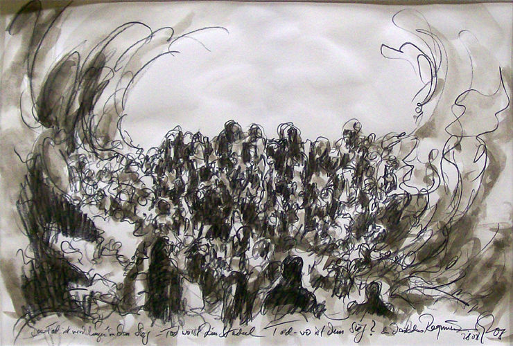 > zurück > | Johannes Brahms: Ein deutsches Requiem | Schönberger Musiksommer 2007 | Zeichnung/Sepia 59,4 x 42cm (c)Helmut Preller >| |