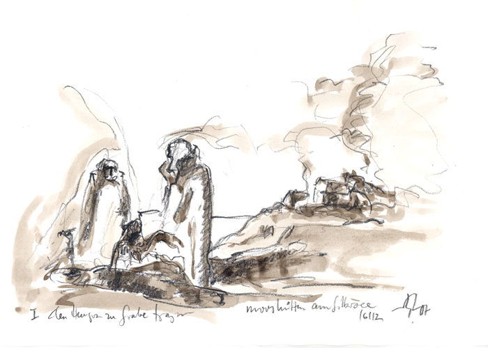Ob Nacht oder Tag, bei Sonn’ – unterm Mond. Wir schaufeln ein pechschwarzes Grab. Es gräbt der Eine dem Andern tief, weich und gut, wart ab, das Grab ... ...Wir tragen den Hunger zu Grabe.