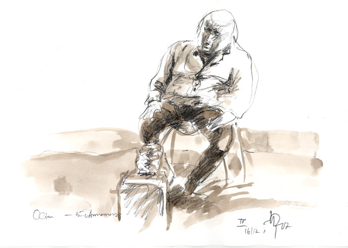 Olim! Olim! Tut es dir nicht leid? Olim! Olim! Geht es dich nichts an? Jetzt bis du auf dem Wege, denk weiter nach! Lass die Gedanken nicht müde werden mitten auf halbem Wege.