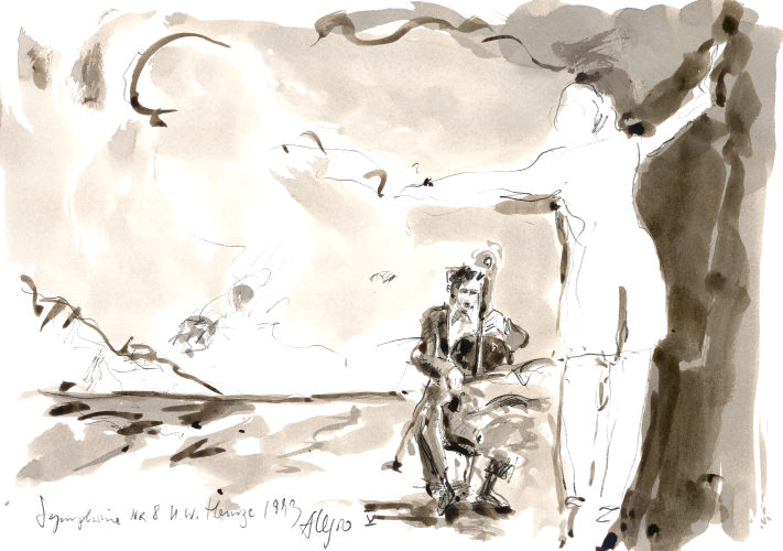 die Zeichnungen von Helmut Preller >| entstanden während des Konzerts - spontan, inspiriert durch die Musik u. Aufführung Hans Werner Henze (*1926) Symphonie Nr.8 (1993) I.Allegro - II.Ballabile. Allegramente,con comodo,con tenerezza - III.Adagio
